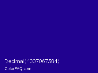 Decimal 4337067584 Color is a dark indigo color and the nearest color is Blue Gem #2c0e8c. Hex code #210290 and RGB value is rgb(33,2,144). In RGB color space, this color is composed of 13% red, 1% green, 56% blue, In CMYK color space, this color is composed of 77% cyan, 99% magenta, 0% yellow , 44% black , In HSL color space, this color has a hue angle of 253° , 97% saturation and 29% lightness.