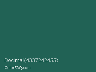 Decimal 4337242455 Color is a dark cyan color and the nearest color is Spectra #2f5a57. Hex code #216255 and RGB value is rgb(33,98,85). In RGB color space, this color is composed of 13% red, 38% green, 33% blue, In CMYK color space, this color is composed of 66% cyan, 0% magenta, 13% yellow , 62% black , In HSL color space, this color has a hue angle of 168° , 50% saturation and 26% lightness.