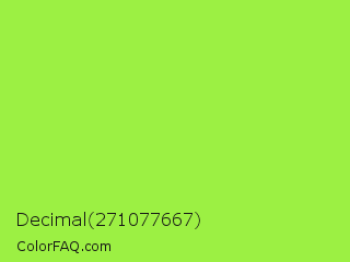 Decimal 271077667 Color is a normal green color and the nearest color is French Lime #9efd38. Hex code #9cf043 and RGB value is rgb(156,240,67). In RGB color space, this color is composed of 61% red, 94% green, 26% blue, In CMYK color space, this color is composed of 35% cyan, 0% magenta, 72% yellow , 6% black , In HSL color space, this color has a hue angle of 89° , 85% saturation and 60% lightness.