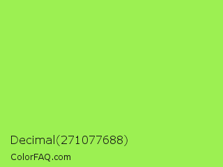 Decimal 271077688 Color is a light green color and the nearest color is Inchworm #b2ec5d. Hex code #9cf052 and RGB value is rgb(156,240,82). In RGB color space, this color is composed of 61% red, 94% green, 32% blue, In CMYK color space, this color is composed of 35% cyan, 0% magenta, 66% yellow , 6% black , In HSL color space, this color has a hue angle of 92° , 84% saturation and 63% lightness.