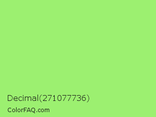 Decimal 271077736 Color is a light green color and the nearest color is Inchworm #b2ec5d. Hex code #9cf070 and RGB value is rgb(156,240,112). In RGB color space, this color is composed of 61% red, 94% green, 44% blue, In CMYK color space, this color is composed of 35% cyan, 0% magenta, 53% yellow , 6% black , In HSL color space, this color has a hue angle of 99° , 81% saturation and 69% lightness.
