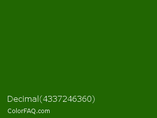 Decimal 4337246360 Color is a very dark green color and the nearest color is Lincoln Green #195905. Hex code #216602 and RGB value is rgb(33,102,2). In RGB color space, this color is composed of 13% red, 40% green, 1% blue, In CMYK color space, this color is composed of 68% cyan, 0% magenta, 98% yellow , 60% black , In HSL color space, this color has a hue angle of 101° , 96% saturation and 20% lightness.