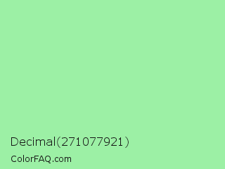 Decimal 271077921 Color is a light green color and the nearest color is Teal Deer #99e6b3. Hex code #9cf0a5 and RGB value is rgb(156,240,165). In RGB color space, this color is composed of 61% red, 94% green, 65% blue, In CMYK color space, this color is composed of 35% cyan, 0% magenta, 31% yellow , 6% black , In HSL color space, this color has a hue angle of 126° , 74% saturation and 78% lightness.