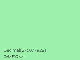 Decimal 271077928 Color is a light green color and the nearest color is Teal Deer #99e6b3. Hex code #9cf0ac and RGB value is rgb(156,240,172). In RGB color space, this color is composed of 61% red, 94% green, 67% blue, In CMYK color space, this color is composed of 35% cyan, 0% magenta, 28% yellow , 6% black , In HSL color space, this color has a hue angle of 131° , 74% saturation and 78% lightness.