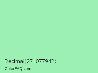 Decimal 271077942 Color is a light green color and the nearest color is Teal Deer #99e6b3. Hex code #9cf0b4 and RGB value is rgb(156,240,180). In RGB color space, this color is composed of 61% red, 94% green, 71% blue, In CMYK color space, this color is composed of 35% cyan, 0% magenta, 25% yellow , 6% black , In HSL color space, this color has a hue angle of 137° , 74% saturation and 78% lightness.
