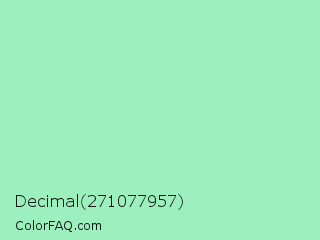 Decimal 271077957 Color is a light green color and the nearest color is Sea Foam Green #9fe2bf. Hex code #9cf0bd and RGB value is rgb(156,240,189). In RGB color space, this color is composed of 61% red, 94% green, 74% blue, In CMYK color space, this color is composed of 35% cyan, 0% magenta, 21% yellow , 6% black , In HSL color space, this color has a hue angle of 144° , 74% saturation and 78% lightness.