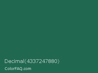 Decimal 4337247880 Color is a dark green color and the nearest color is Green Pea #1d6142. Hex code #216850 and RGB value is rgb(33,104,80). In RGB color space, this color is composed of 13% red, 41% green, 31% blue, In CMYK color space, this color is composed of 68% cyan, 0% magenta, 23% yellow , 59% black , In HSL color space, this color has a hue angle of 160° , 52% saturation and 27% lightness.