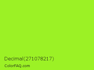 Decimal 271078217 Color is a normal green color and the nearest color is Green Lizard #a7f432. Hex code #9cf125 and RGB value is rgb(156,241,37). In RGB color space, this color is composed of 61% red, 95% green, 15% blue, In CMYK color space, this color is composed of 35% cyan, 0% magenta, 85% yellow , 5% black , In HSL color space, this color has a hue angle of 85° , 88% saturation and 55% lightness.