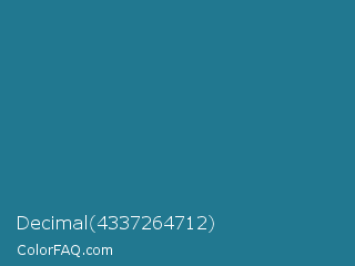 Decimal 4337264712 Color is a normal cyan color and the nearest color is Jelly Bean #297b9a. Hex code #217890 and RGB value is rgb(33,120,144). In RGB color space, this color is composed of 13% red, 47% green, 56% blue, In CMYK color space, this color is composed of 77% cyan, 17% magenta, 0% yellow , 44% black , In HSL color space, this color has a hue angle of 193° , 63% saturation and 35% lightness.