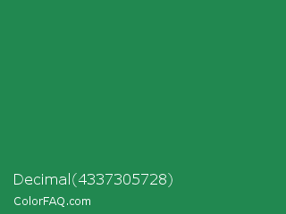 Decimal 4337305728 Color is a normal green color and the nearest color is Eucalyptus #278a5b. Hex code #218850 and RGB value is rgb(33,136,80). In RGB color space, this color is composed of 13% red, 53% green, 31% blue, In CMYK color space, this color is composed of 76% cyan, 0% magenta, 41% yellow , 47% black , In HSL color space, this color has a hue angle of 147° , 61% saturation and 33% lightness.