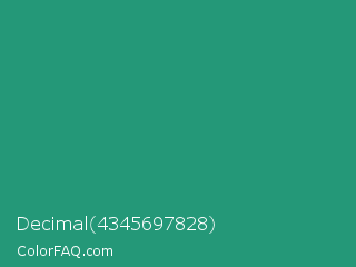 Decimal 4345697828 Color is a normal green color and the nearest color is Illuminating Emerald #319177. Hex code #249878 and RGB value is rgb(36,152,120). In RGB color space, this color is composed of 14% red, 60% green, 47% blue, In CMYK color space, this color is composed of 76% cyan, 0% magenta, 21% yellow , 40% black , In HSL color space, this color has a hue angle of 163° , 62% saturation and 37% lightness.
