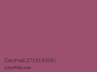 Decimal 271619206 Color is a normal rose color and the nearest color is China Rose #a8516e. Hex code #9d4f6e and RGB value is rgb(157,79,110). In RGB color space, this color is composed of 62% red, 31% green, 43% blue, In CMYK color space, this color is composed of 0% cyan, 50% magenta, 30% yellow , 38% black , In HSL color space, this color has a hue angle of 336° , 33% saturation and 46% lightness.