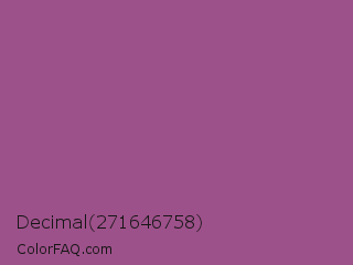 Decimal 271646758 Color is a normal magenta color and the nearest color is Razzmic Berry #8d4e85. Hex code #9d518a and RGB value is rgb(157,81,138). In RGB color space, this color is composed of 62% red, 32% green, 54% blue, In CMYK color space, this color is composed of 0% cyan, 48% magenta, 12% yellow , 38% black , In HSL color space, this color has a hue angle of 315° , 32% saturation and 47% lightness.