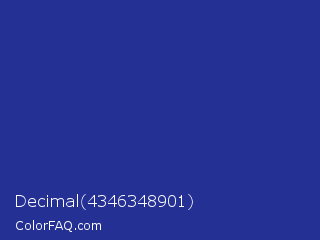 Decimal 4346348901 Color is a normal blue color and the nearest color is Blue Pigment #333399. Hex code #253095 and RGB value is rgb(37,48,149). In RGB color space, this color is composed of 15% red, 19% green, 58% blue, In CMYK color space, this color is composed of 75% cyan, 68% magenta, 0% yellow , 42% black , In HSL color space, this color has a hue angle of 234° , 60% saturation and 36% lightness.