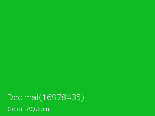 Decimal 16978435 Color is a normal green color and the nearest color is Vivid Malachite #00cc33. Hex code #0fbc23 and RGB value is rgb(15,188,35). In RGB color space, this color is composed of 6% red, 74% green, 14% blue, In CMYK color space, this color is composed of 92% cyan, 0% magenta, 81% yellow , 26% black , In HSL color space, this color has a hue angle of 127° , 85% saturation and 40% lightness.