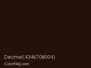 Decimal 4346708004 Color is a almost black orange color and the nearest color is Wood Bark #261105. Hex code #261108 and RGB value is rgb(38,17,8). In RGB color space, this color is composed of 15% red, 7% green, 3% blue, In CMYK color space, this color is composed of 0% cyan, 55% magenta, 79% yellow , 85% black , In HSL color space, this color has a hue angle of 18° , 65% saturation and 9% lightness.