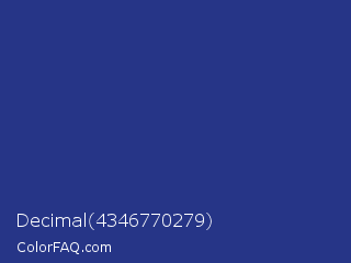 Decimal 4346770279 Color is a normal blue color and the nearest color is Bay Of Many #273a81. Hex code #263587 and RGB value is rgb(38,53,135). In RGB color space, this color is composed of 15% red, 21% green, 53% blue, In CMYK color space, this color is composed of 72% cyan, 61% magenta, 0% yellow , 47% black , In HSL color space, this color has a hue angle of 231° , 56% saturation and 34% lightness.