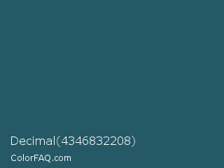 Decimal 4346832208 Color is a dark cyan color and the nearest color is Casal #2f6168. Hex code #265966 and RGB value is rgb(38,89,102). In RGB color space, this color is composed of 15% red, 35% green, 40% blue, In CMYK color space, this color is composed of 63% cyan, 13% magenta, 0% yellow , 60% black , In HSL color space, this color has a hue angle of 192° , 46% saturation and 27% lightness.