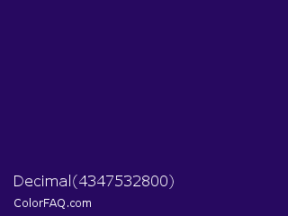 Decimal 4347532800 Color is a very dark violet color and the nearest color is Violent Violet #290c5e. Hex code #270960 and RGB value is rgb(39,9,96). In RGB color space, this color is composed of 15% red, 4% green, 38% blue, In CMYK color space, this color is composed of 59% cyan, 91% magenta, 0% yellow , 62% black , In HSL color space, this color has a hue angle of 261° , 83% saturation and 21% lightness.