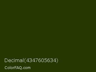 Decimal 4347605634 Color is a very dark lime color and the nearest color is Turtle Green #2a380b. Hex code #273702 and RGB value is rgb(39,55,2). In RGB color space, this color is composed of 15% red, 22% green, 1% blue, In CMYK color space, this color is composed of 29% cyan, 0% magenta, 96% yellow , 78% black , In HSL color space, this color has a hue angle of 78° , 93% saturation and 11% lightness.
