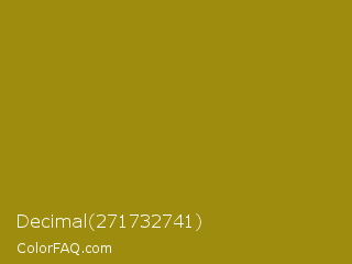 Decimal 271732741 Color is a normal yellow color and the nearest color is Dark Yellow #9b870c. Hex code #9d8c0d and RGB value is rgb(157,140,13). In RGB color space, this color is composed of 62% red, 55% green, 5% blue, In CMYK color space, this color is composed of 0% cyan, 11% magenta, 92% yellow , 38% black , In HSL color space, this color has a hue angle of 53° , 85% saturation and 33% lightness.