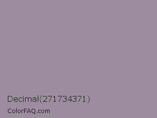 Decimal 271734371 Color is a normal magenta color and the nearest color is Mountain Mist #959396. Hex code #9d8e9f and RGB value is rgb(157,142,159). In RGB color space, this color is composed of 62% red, 56% green, 62% blue, In CMYK color space, this color is composed of 1% cyan, 11% magenta, 0% yellow , 38% black , In HSL color space, this color has a hue angle of 293° , 8% saturation and 59% lightness.