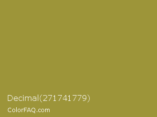 Decimal 271741779 Color is a normal yellow color and the nearest color is Sycamore #908d39. Hex code #9d9539 and RGB value is rgb(157,149,57). In RGB color space, this color is composed of 62% red, 58% green, 22% blue, In CMYK color space, this color is composed of 0% cyan, 5% magenta, 64% yellow , 38% black , In HSL color space, this color has a hue angle of 55° , 47% saturation and 42% lightness.