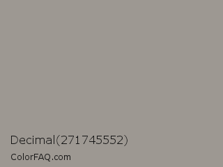 Decimal 271745552 Color is a normal orange color and the nearest color is Lemon Grass #9b9e8f. Hex code #9d9892 and RGB value is rgb(157,152,146). In RGB color space, this color is composed of 62% red, 60% green, 57% blue, In CMYK color space, this color is composed of 0% cyan, 3% magenta, 7% yellow , 38% black , In HSL color space, this color has a hue angle of 33° , 5% saturation and 59% lightness.