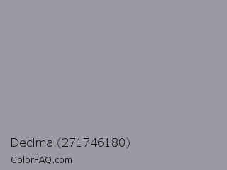 Decimal 271746180 Color is a light violet color and the nearest color is Manatee #979aaa. Hex code #9d99a4 and RGB value is rgb(157,153,164). In RGB color space, this color is composed of 62% red, 60% green, 64% blue, In CMYK color space, this color is composed of 4% cyan, 7% magenta, 0% yellow , 36% black , In HSL color space, this color has a hue angle of 262° , 6% saturation and 62% lightness.