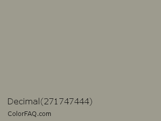 Decimal 271747444 Color is a normal yellow color and the nearest color is Lemon Grass #9b9e8f. Hex code #9d9b8e and RGB value is rgb(157,155,142). In RGB color space, this color is composed of 62% red, 61% green, 56% blue, In CMYK color space, this color is composed of 0% cyan, 1% magenta, 10% yellow , 38% black , In HSL color space, this color has a hue angle of 52° , 7% saturation and 59% lightness.