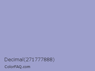 Decimal 271777888 Color is a light blue color and the nearest color is Blue Bell #a2a2d0. Hex code #9d9fcc and RGB value is rgb(157,159,204). In RGB color space, this color is composed of 62% red, 62% green, 80% blue, In CMYK color space, this color is composed of 23% cyan, 22% magenta, 0% yellow , 20% black , In HSL color space, this color has a hue angle of 237° , 32% saturation and 71% lightness.