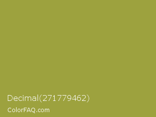 Decimal 271779462 Color is a normal yellow color and the nearest color is Sushi #87ab39. Hex code #9da23e and RGB value is rgb(157,162,62). In RGB color space, this color is composed of 62% red, 64% green, 24% blue, In CMYK color space, this color is composed of 3% cyan, 0% magenta, 62% yellow , 36% black , In HSL color space, this color has a hue angle of 63° , 45% saturation and 44% lightness.