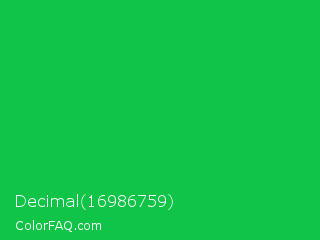 Decimal 16986759 Color is a normal green color and the nearest color is Dark Pastel Green #03c03c. Hex code #0fc447 and RGB value is rgb(15,196,71). In RGB color space, this color is composed of 6% red, 77% green, 28% blue, In CMYK color space, this color is composed of 92% cyan, 0% magenta, 64% yellow , 23% black , In HSL color space, this color has a hue angle of 139° , 86% saturation and 41% lightness.