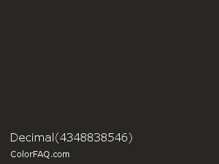Decimal 4348838546 Color is a very dark orange color and the nearest color is Raisin Black #242124. Hex code #292724 and RGB value is rgb(41,39,36). In RGB color space, this color is composed of 16% red, 15% green, 14% blue, In CMYK color space, this color is composed of 0% cyan, 5% magenta, 12% yellow , 84% black , In HSL color space, this color has a hue angle of 36° , 6% saturation and 15% lightness.
