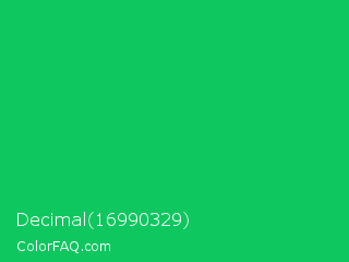 Decimal 16990329 Color is a normal green color and the nearest color is Malachite #0bda51. Hex code #0fc75f and RGB value is rgb(15,199,95). In RGB color space, this color is composed of 6% red, 78% green, 37% blue, In CMYK color space, this color is composed of 92% cyan, 0% magenta, 52% yellow , 22% black , In HSL color space, this color has a hue angle of 146° , 86% saturation and 42% lightness.