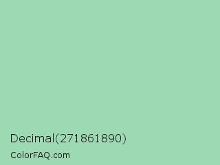 Decimal 271861890 Color is a light green color and the nearest color is Turquoise Green #a0d6b4. Hex code #9dd9b2 and RGB value is rgb(157,217,178). In RGB color space, this color is composed of 62% red, 85% green, 70% blue, In CMYK color space, this color is composed of 28% cyan, 0% magenta, 18% yellow , 15% black , In HSL color space, this color has a hue angle of 141° , 44% saturation and 73% lightness.