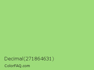 Decimal 271864631 Color is a light green color and the nearest color is Feijoa #9fdd8c. Hex code #9ddb79 and RGB value is rgb(157,219,121). In RGB color space, this color is composed of 62% red, 86% green, 47% blue, In CMYK color space, this color is composed of 28% cyan, 0% magenta, 45% yellow , 14% black , In HSL color space, this color has a hue angle of 98° , 58% saturation and 67% lightness.