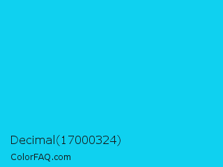 Decimal 17000324 Color is a normal cyan color and the nearest color is Spiro Disco Ball #0fc0fc. Hex code #0fd1f0 and RGB value is rgb(15,209,240). In RGB color space, this color is composed of 6% red, 82% green, 94% blue, In CMYK color space, this color is composed of 94% cyan, 13% magenta, 0% yellow , 6% black , In HSL color space, this color has a hue angle of 188° , 88% saturation and 50% lightness.