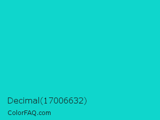 Decimal 17006632 Color is a normal cyan color and the nearest color is Dark Turquoise #00ced1. Hex code #0fd6cc and RGB value is rgb(15,214,204). In RGB color space, this color is composed of 6% red, 84% green, 80% blue, In CMYK color space, this color is composed of 93% cyan, 0% magenta, 5% yellow , 16% black , In HSL color space, this color has a hue angle of 177° , 87% saturation and 45% lightness.