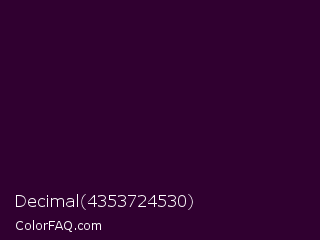 Decimal 4353724530 Color is a almost black magenta color and the nearest color is Mardi Gras #350036. Hex code #300030 and RGB value is rgb(48,0,48). In RGB color space, this color is composed of 19% red, 0% green, 19% blue, In CMYK color space, this color is composed of 0% cyan, 100% magenta, 0% yellow , 81% black , In HSL color space, this color has a hue angle of 300° , 100% saturation and 9% lightness.