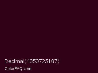 Decimal 4353725187 Color is a very dark rose color and the nearest color is Toledo #3a0020. Hex code #300117 and RGB value is rgb(48,1,23). In RGB color space, this color is composed of 19% red, 0% green, 9% blue, In CMYK color space, this color is composed of 0% cyan, 98% magenta, 52% yellow , 81% black , In HSL color space, this color has a hue angle of 332° , 96% saturation and 10% lightness.