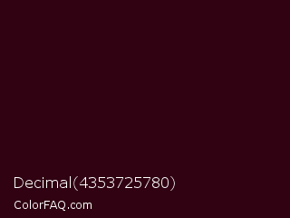 Decimal 4353725780 Color is a very dark rose color and the nearest color is Aubergine #3b0910. Hex code #300212 and RGB value is rgb(48,2,18). In RGB color space, this color is composed of 19% red, 1% green, 7% blue, In CMYK color space, this color is composed of 0% cyan, 96% magenta, 63% yellow , 81% black , In HSL color space, this color has a hue angle of 339° , 92% saturation and 10% lightness.