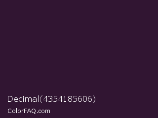 Decimal 4354185606 Color is a very dark magenta color and the nearest color is Dark Purple #301934. Hex code #311532 and RGB value is rgb(49,21,50). In RGB color space, this color is composed of 19% red, 8% green, 20% blue, In CMYK color space, this color is composed of 2% cyan, 58% magenta, 0% yellow , 80% black , In HSL color space, this color has a hue angle of 298° , 41% saturation and 14% lightness.