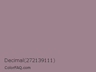 Decimal 272139111 Color is a normal rose color and the nearest color is Mountbatten Pink #997a8d. Hex code #9e838f and RGB value is rgb(158,131,143). In RGB color space, this color is composed of 62% red, 51% green, 56% blue, In CMYK color space, this color is composed of 0% cyan, 17% magenta, 9% yellow , 38% black , In HSL color space, this color has a hue angle of 333° , 12% saturation and 57% lightness.