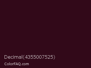 Decimal 4355007525 Color is a very dark rose color and the nearest color is Aubergine #3b0910. Hex code #320919 and RGB value is rgb(50,9,25). In RGB color space, this color is composed of 20% red, 4% green, 10% blue, In CMYK color space, this color is composed of 0% cyan, 82% magenta, 50% yellow , 80% black , In HSL color space, this color has a hue angle of 337° , 69% saturation and 12% lightness.