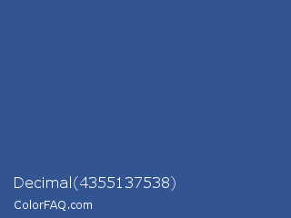Decimal 4355137538 Color is a normal blue color and the nearest color is B Dazzled Blue #2e5894. Hex code #325592 and RGB value is rgb(50,85,146). In RGB color space, this color is composed of 20% red, 33% green, 57% blue, In CMYK color space, this color is composed of 66% cyan, 42% magenta, 0% yellow , 43% black , In HSL color space, this color has a hue angle of 218° , 49% saturation and 38% lightness.
