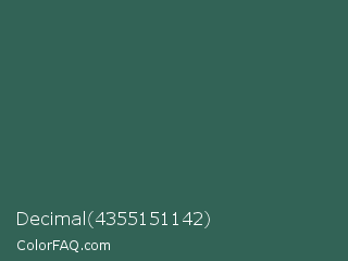 Decimal 4355151142 Color is a dark cyan color and the nearest color is Stromboli #325d52. Hex code #326356 and RGB value is rgb(50,99,86). In RGB color space, this color is composed of 20% red, 39% green, 34% blue, In CMYK color space, this color is composed of 49% cyan, 0% magenta, 13% yellow , 61% black , In HSL color space, this color has a hue angle of 164° , 33% saturation and 29% lightness.