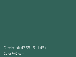 Decimal 4355151145 Color is a dark cyan color and the nearest color is Stromboli #325d52. Hex code #326359 and RGB value is rgb(50,99,89). In RGB color space, this color is composed of 20% red, 39% green, 35% blue, In CMYK color space, this color is composed of 49% cyan, 0% magenta, 10% yellow , 61% black , In HSL color space, this color has a hue angle of 168° , 33% saturation and 29% lightness.