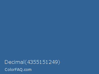 Decimal 4355151249 Color is a normal blue color and the nearest color is B Dazzled Blue #2e5894. Hex code #326397 and RGB value is rgb(50,99,151). In RGB color space, this color is composed of 20% red, 39% green, 59% blue, In CMYK color space, this color is composed of 67% cyan, 34% magenta, 0% yellow , 41% black , In HSL color space, this color has a hue angle of 211° , 50% saturation and 39% lightness.
