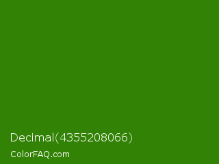 Decimal 4355208066 Color is a dark green color and the nearest color is Napier Green #2a8000. Hex code #328206 and RGB value is rgb(50,130,6). In RGB color space, this color is composed of 20% red, 51% green, 2% blue, In CMYK color space, this color is composed of 62% cyan, 0% magenta, 95% yellow , 49% black , In HSL color space, this color has a hue angle of 99° , 91% saturation and 27% lightness.